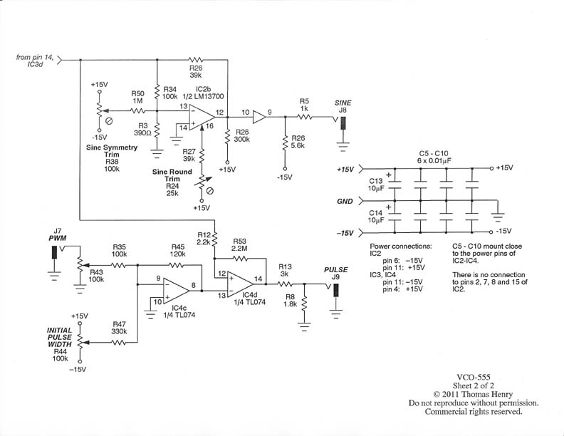 There are ramp, triangle, pulse and sine outputs, all of which are decent looking. The sync is a real treat and basically comes along for free. And, of course, there are the usual VCO features such as coarse and fine tuning, exponential and linear FM, etc. If you're looking for cleverness, then be sure to check out how I did the sync, the ramp, and buffered the sine to keep the chip count down.