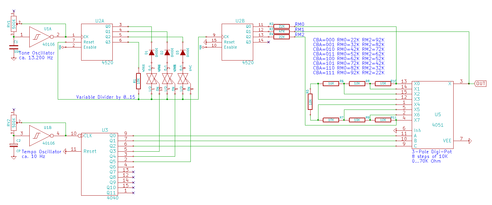 Also in the larger schematic, you find a tone generator with variable divider. This is similar to the 16-step divider circuit. The output goes to a counter that connects to the three digi-pot inputs. A 4040 is used to generate the timing for the selection inputs for the digi-pot (Q0..Q2) as well as the divider setting (Q3..Q5) for the tone frequency. In the schematic I omitted the inverters for the outputs in order to get an ascending sequence. For the modulation, each tone needs to go through the eight digi-pot steps while it is playing. The result is a waveform that changes in eight steps from a jagged waveform with many overtones to a simple stepped ramp-like waveform.