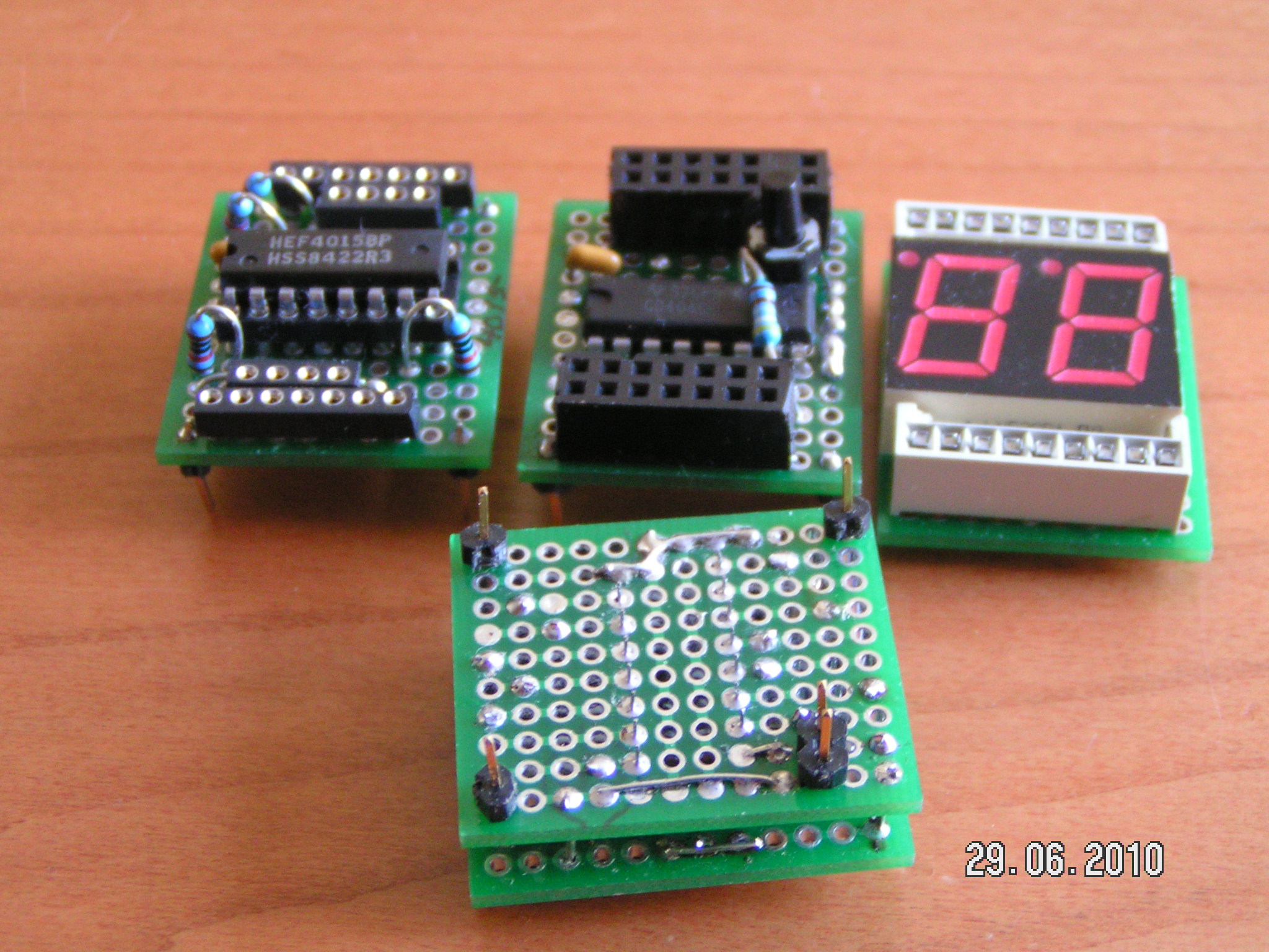 topside, up/down, left to right: Pulldownresistors, LED's, 4017 output bay 8x4, sound input 1x4, control input 4x8, sound output 1x4