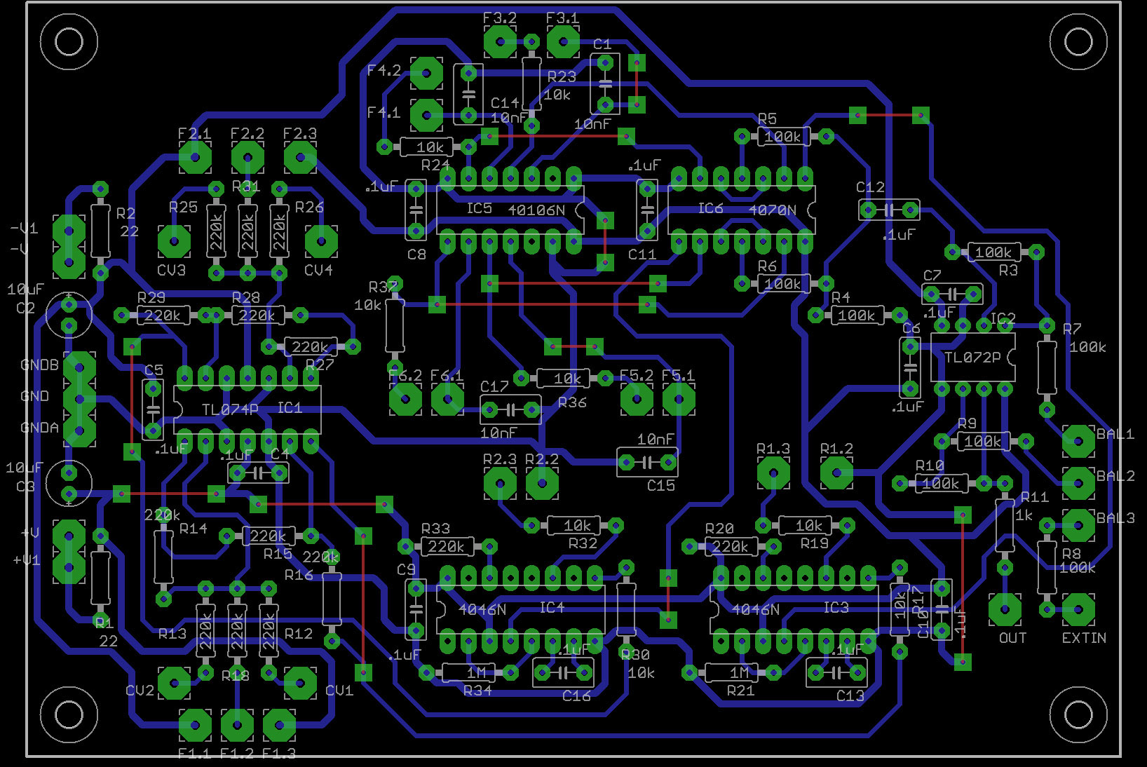 February 11, 2011 - Plans have changed a bit, to have boards produced by a board house due to larger order volume than expected. They will be $17 each. Those that would like to drill their own can get boards made by me for $15 each, that are NOT drilled. (view this post for the detailed information about this change: http://electro-music.com/forum/post-322233.html#322233 )