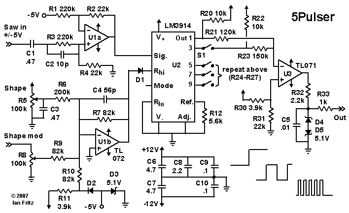 From this I figured out how to make an interesting waveshaper that puts out a variable pulse train. The waveshape control voltage changes the span of the comparators, so an input sawtooth leads to a train of pulses from a single square wave up to a train of five pulses in less than half a period as the control voltage is varied. (The more traditional wavefolders use a VCA on the input signal to vary the waveshape.) The circuit is quite simple for what it does -- a dual opamp for the input signal and CV conditioning, the LM3914 and an output opamp summer to combine the pulses.