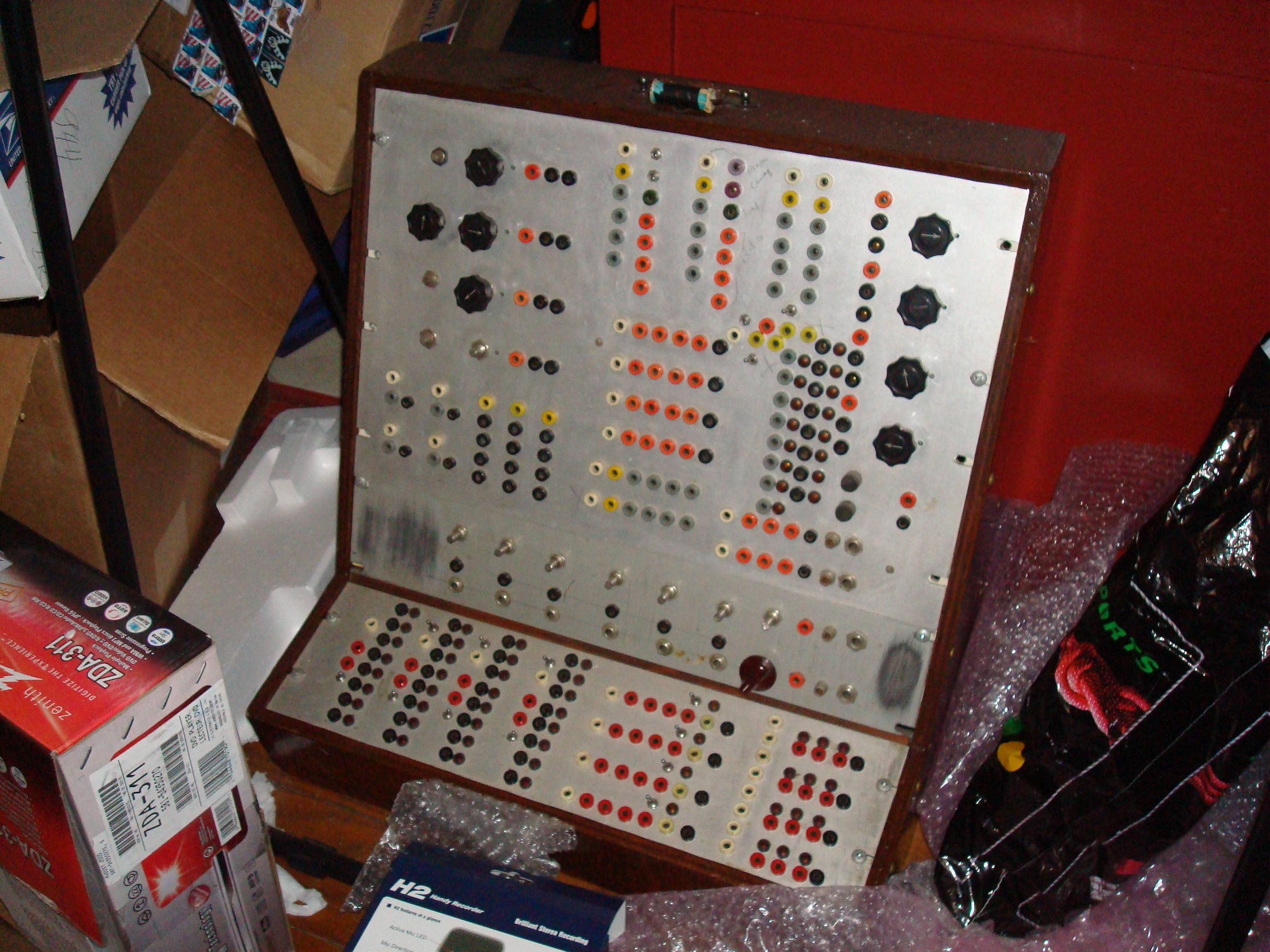 All these simple circuits, usually just one "naked" IC, are hooked up to banna jacks so you can make patches.