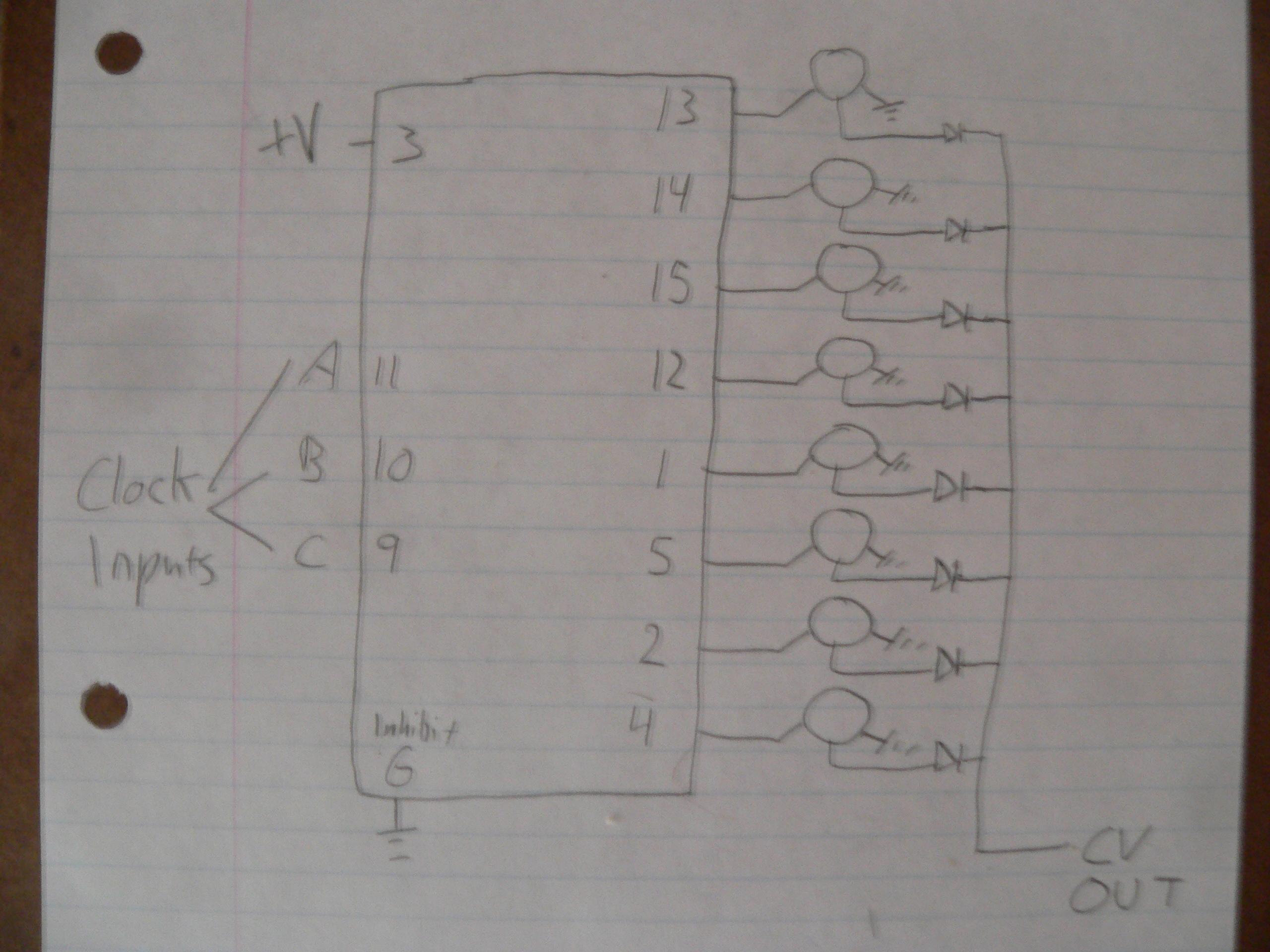 so, i think you are saying that instead, yours had a pot on each input to the 4051? so actually, you were using all 8 as outputs? and you dioded them together and stuck that into pin 8 of another 40106?