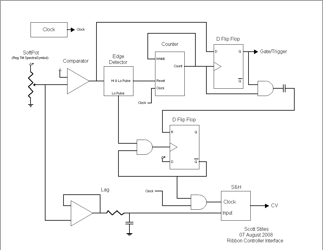8. /Q of the second flip flop goes high on reset, allowing the Sample and Hold to be constantly clocked, thus allowing the output of the S&H to follow the movement of the voltage supplied by the soft pot through the lag circuit.
