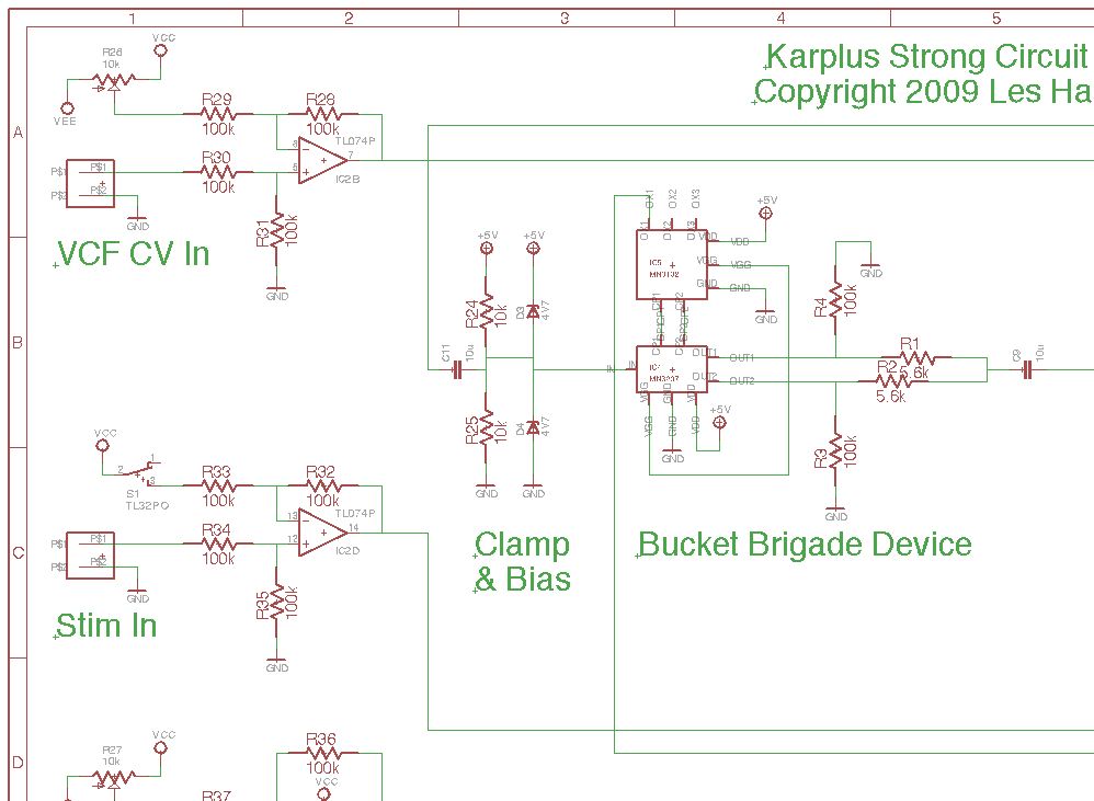 Thanks Andy, I've put a lot of work into it already. Karplus Strong is this really simple digital algorithm for making string and percussion sounds. I'm implementing it in analog form. The basis of KS is a summing amp with a delay line and a filter in the feedback loop. Adjust the loop gain properly, set up the filter and delay line characteristics, and hit the stim input to get a guitar or sitar or percussion kind of sound.