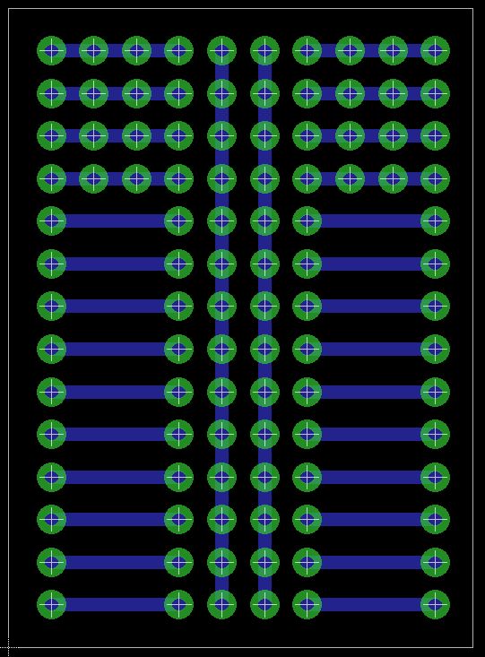 Thing 3 is that by making the board this way it becomes a general purpose prototyping board that can be used in many ways. Why not just buy protoboards and cut them up? Because cutting them up is not easy nor does it lead to neat, clean results. Also this design has the power and ground rails running underneath the chip instead of at the sides, which is what we need. Besides, protoboards are a rip-off unless you find a cheap supplier.