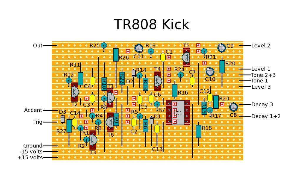 Here's a stripboard layout for the Kick drum.