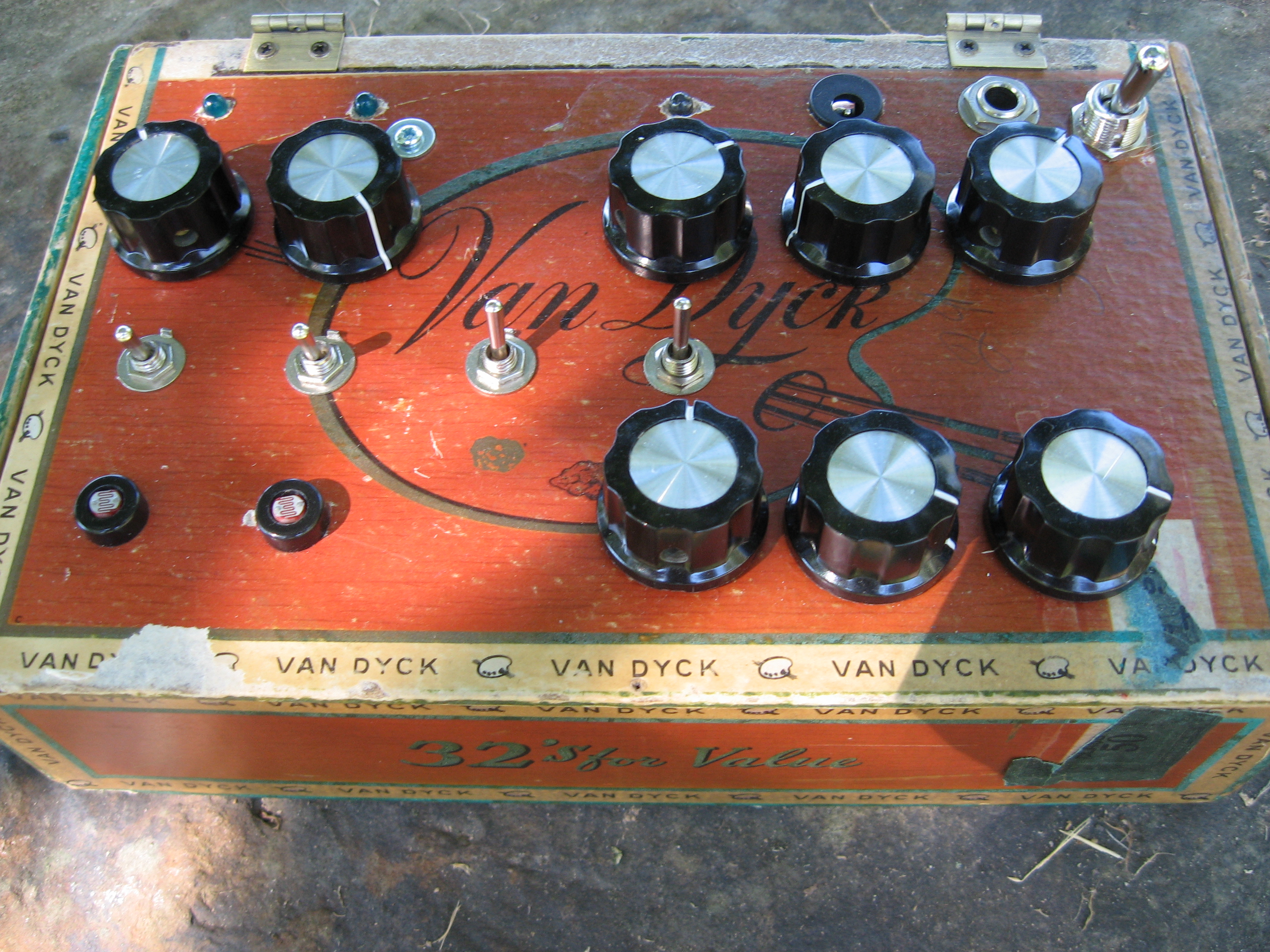 Damon Mar of Marsynth made this wonderful cigar box synth for me. I totally love it. It has 2 oscillators (knob or photocell triggered), lfo, and filter cutoff and resonance.