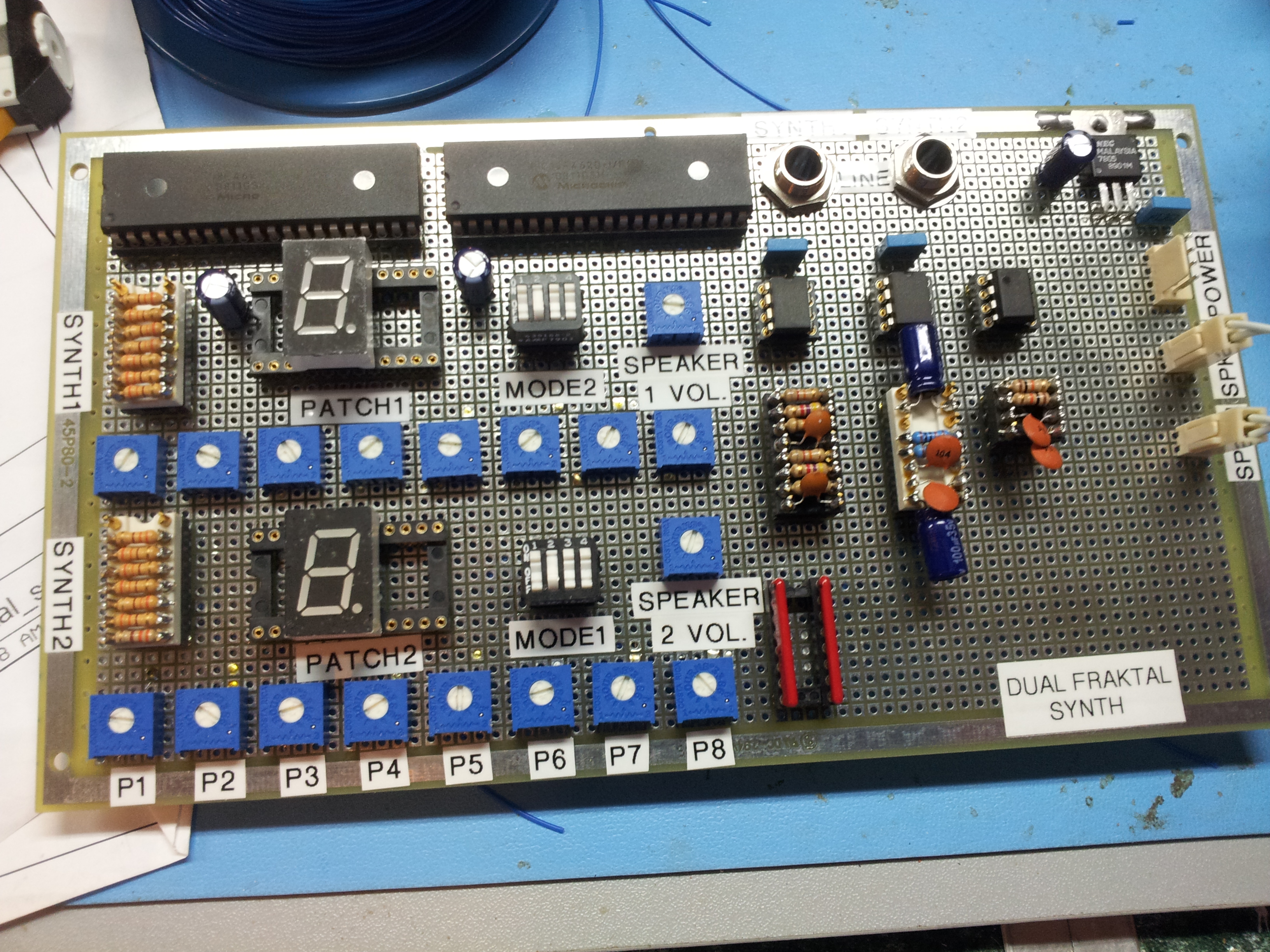 Here are a couple pictures of a dual Fractal Synthesizer on a vector board. The is will used as part of a DIY setup at this years electro-music 2012 electronic music festival. It will be a collaboration entitled "The Soldering Musician and the Personal Digital Assistants". The board contains the original speaker amplifier for stand alone operation when connected to speakers and also has an LM358 based , capacitive coupled, LINE amplifier/buffer to connect to an audio mixer.