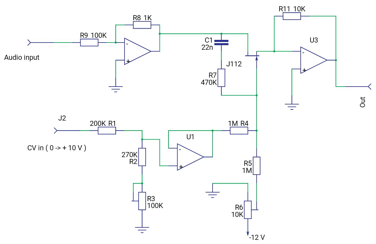 I've built it on a breadboard and it works well in terms of distortion. The unusual thing about it is the relationship between CV and gain, which is neither linear or exponential in nature. |