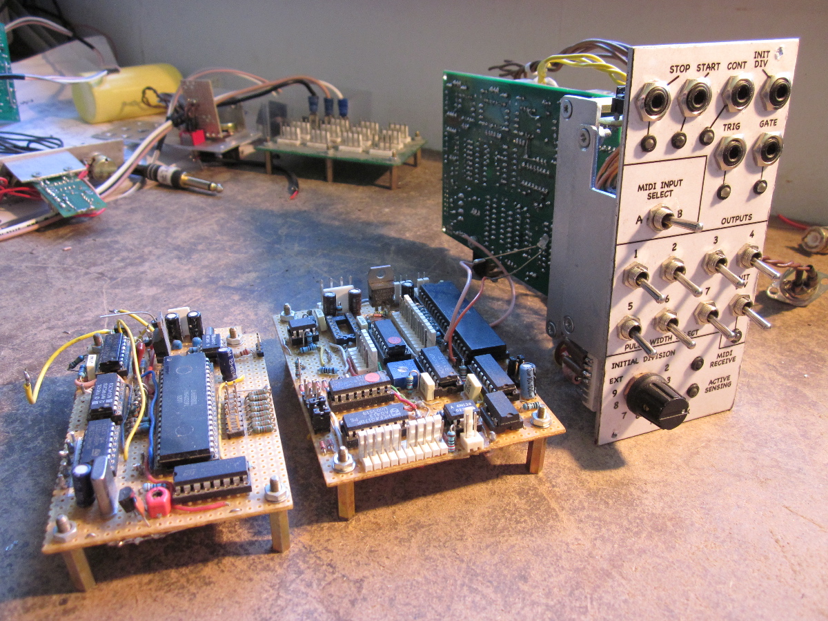 Yesterday i saw a picture of your panel on the Matrixsynth blog, and i googled 'Dave Kendall midi clock' with no results. I am glad to see this thread here, i would be very interested in case of a run of pcbs for this project, even if i am not sure what is the exact function of the 8 switches and the rotary one.. i guess two stages of clock division starting from midi's 24ppqn?