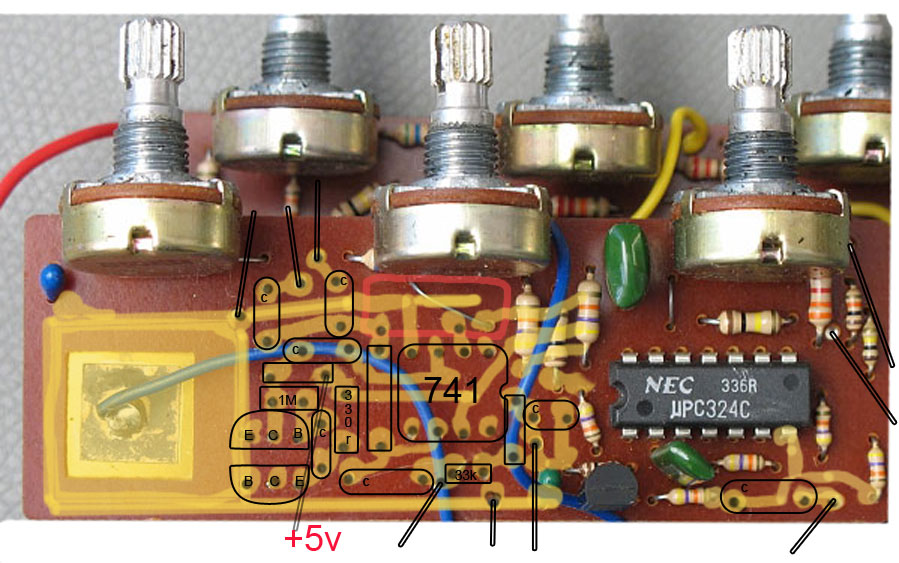 You have two holes unfilled, I'd say they're for a jumper, to allow pins 2 & 6 to connect through the 470k resistor (the vertical unmarked rectangle left of the 741). Note that according to Marc's schem, there should also be a 22p cap across that resistor, to tame the trebles (I don't know much but I think it's usual with 741s). Maybe the engineers at Coron didn't give a f*** about taming any treble whatsoever, just a gang of punks, you see ?