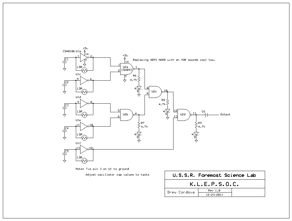 It's just a 40106 with five oscillators running into the inputs of a 4011 NAND. LDR's in place of pots for frequency control. It's got a pretty gnarly range of sounds for being so simple! Oh, and the antenna is completely aesthetic... Couldn't figure out a use for it in time. Oh well!