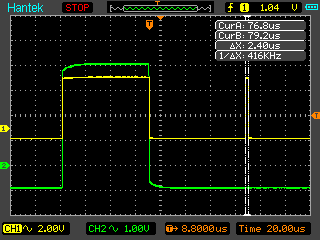 The pictures I have attached show the Arduino running in a streaming mode (playing a song), and the PicAxe is running a small loop that only executes the AY-Voice "Store:" subroutine. From what I see the time issue is related to placing the "Value" on the bus and the latch width. The Write pulse seems fine and can even be shortened if needed. The setup time for the Inactive state is also quite long. If you look at the "Store:" subroutine there are no delays except for the AY_Pulse which Thomas set to 2.5uS. The scope shows that this is right on the money with a width of 2.4uS.