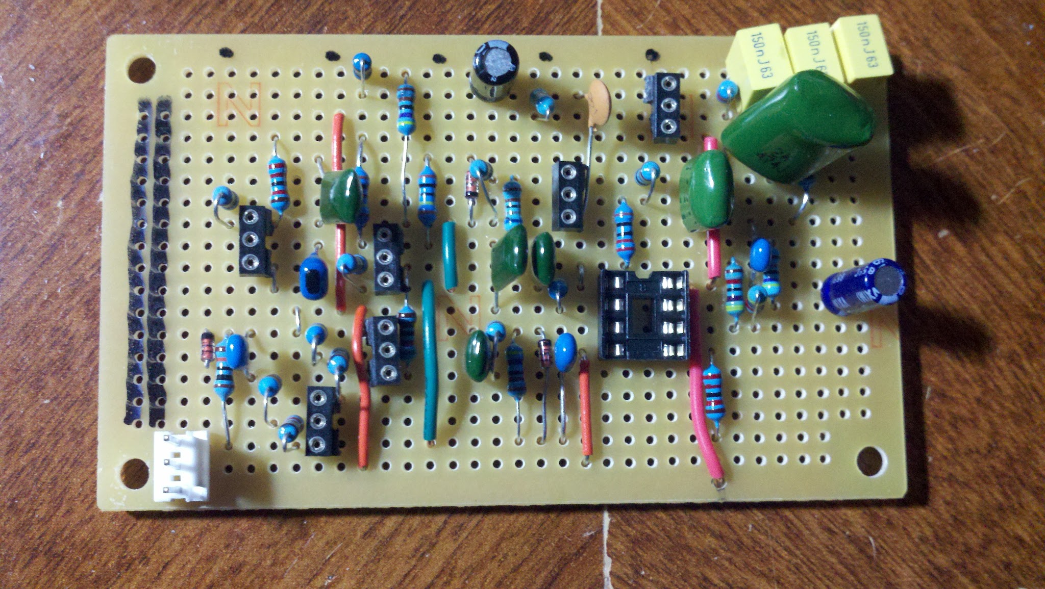 OK. I've just dragged that old stripboard diagram into Illustrator and traced around all the components and checked with the schematic. I can see only two things. That cut I mentioned above needs to be made. Also, the output needs to be dropped down one rail. At present it is not going through R25, the 1K resistor. Apart from that the layout looks correct to me. I'll dig out my old board and make the adjustments. Hopefully you haven't been skinned! I thought this WAS work!