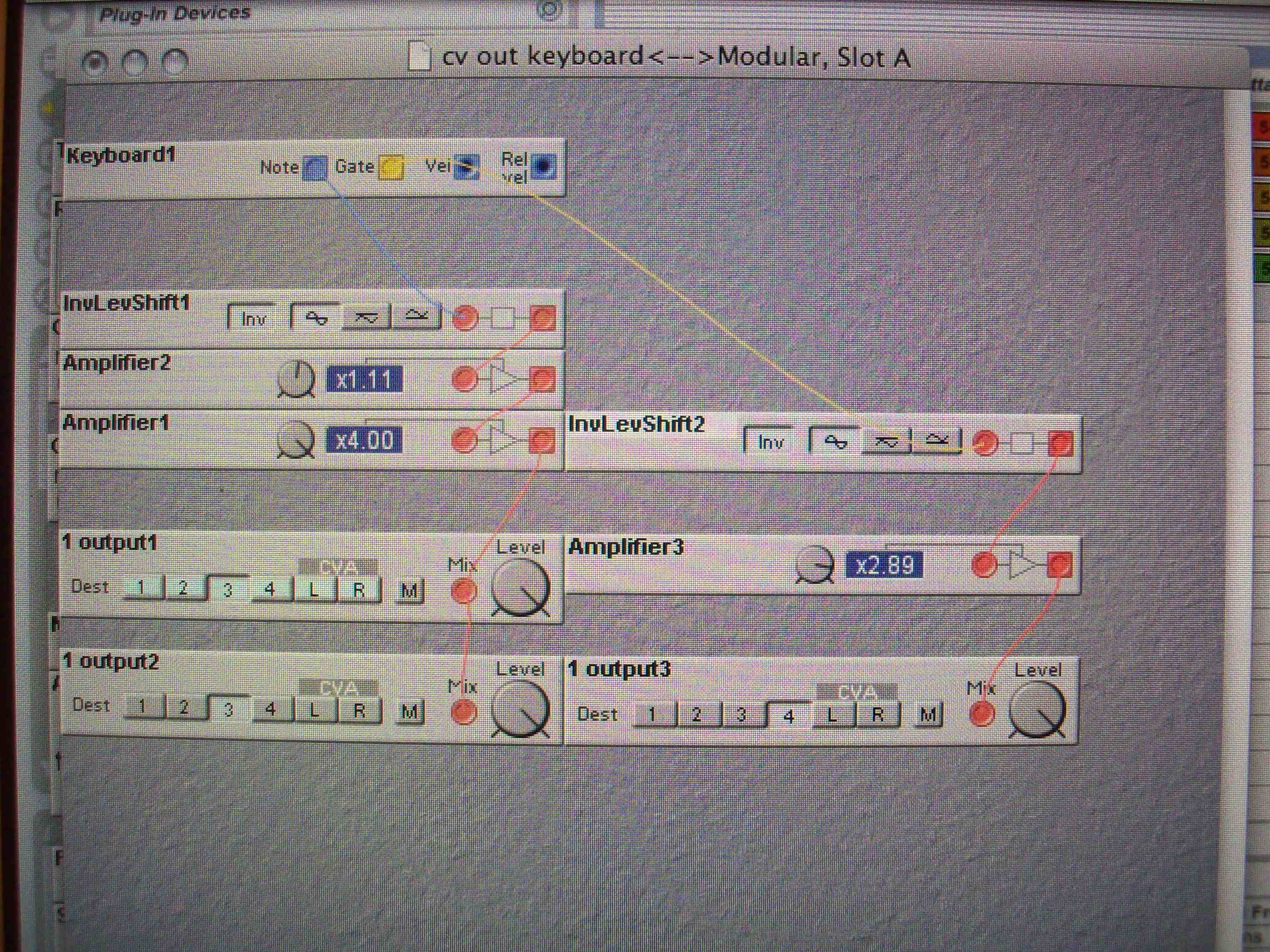 OK I've been working on the c/v out plan, found some simple opamp circuits on howtobuildarobot.com web site. I was about to order some parts then thought I would check output voltage again and I was able to get 4.78v. I headed to Radio Shack to pick up a couple 1/8" cables with stripped ends and 1/4th watt 470 ohm resistors. The varice mod only took about a half hour. I tried playing the keyboard, not only was it not 1v/octave but the higher up I would play the lower the oscillator would go! The output voltage is inverted! That was a bit mind bending. Once I used the voltage inverter part of the InvLevShift module it sounded better. Maybe this is what 3phase was referring to when he wrote about the NM1 signal not being scalable or useable. I have gotten in the 4+ volt range by inserting an amplifier module and cabling the output to the same channel of 2 separate output modules. I haven't figured out what settings yield 1v/octave yet.