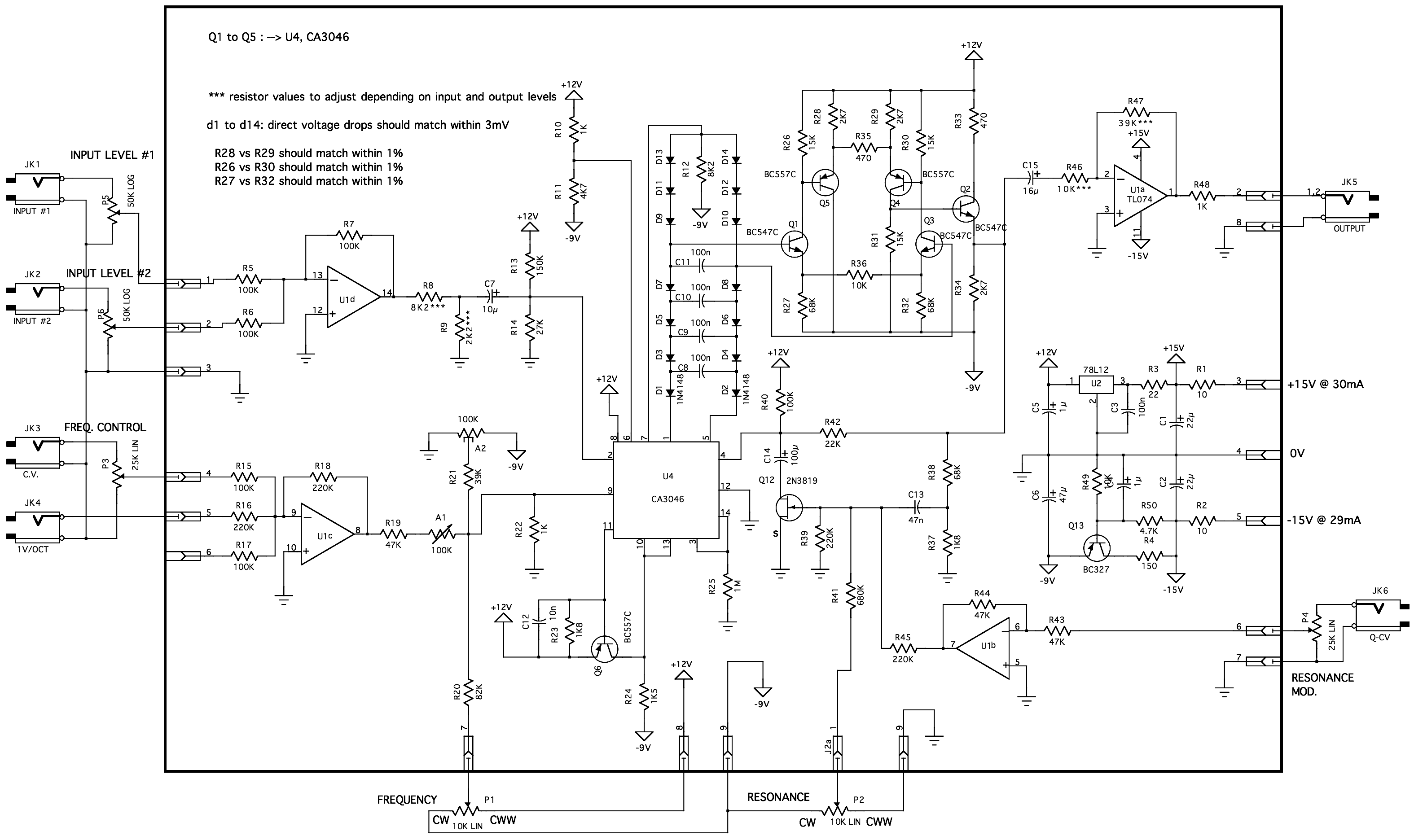 My aim here was to design a quite faithful copy of this mythic filter while using components that minimize the burden of selecting a great number of matched transistors. This is why I used transistor arrays (CA3046, CA3096). However, because the CA3096 has become a rare part and is now overpriced, I have also designed a PCB with discrete trannies to replace it. As for all the other filters of my YUSYNTH project, I have added an input and an output buffer to adapt this filter to the input and output levels of my modular system.