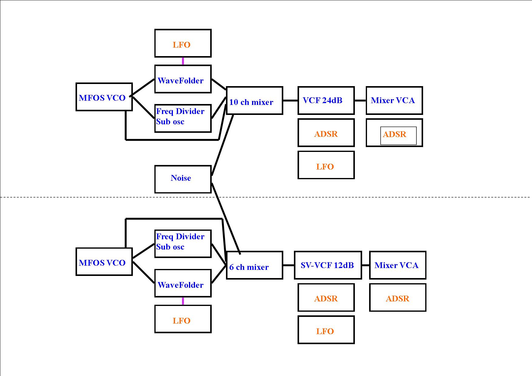 I have a mfos lowpass for vcf1 and a mfos state variable for vcf2 that are to be taken from the modular .