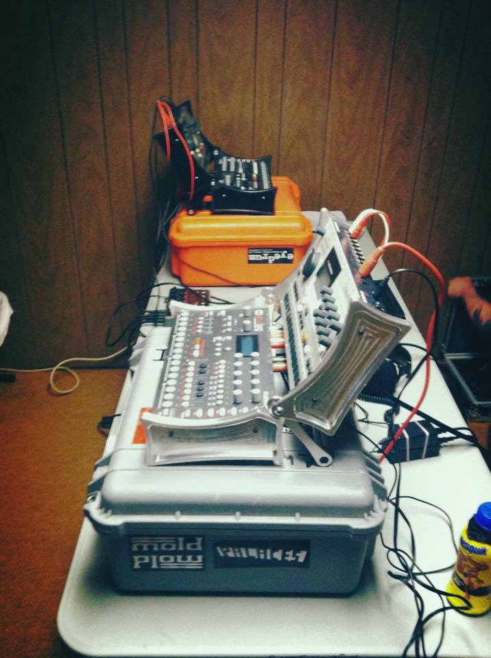 guitar +ebow, Alesis DM10 Studio kit, Yamaha RM1x, Novation K Station, Korg TR rack, Novation KS rack, Roland SH-32, Waldorf Blofeld and Korg Monotron Delay.