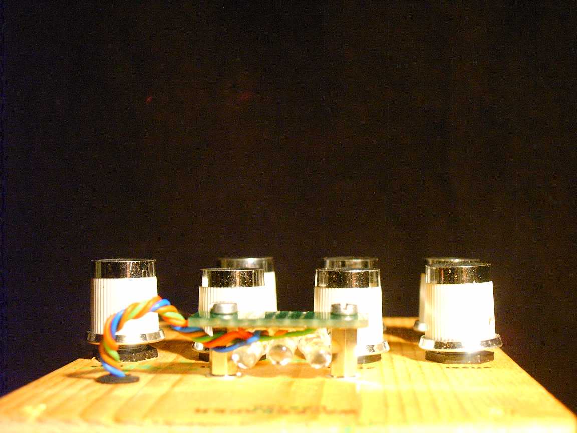 I used bright green LED's but since I don't want to be blinded by them I bend them 90 degrees and mounted them on a piece of perf. This way