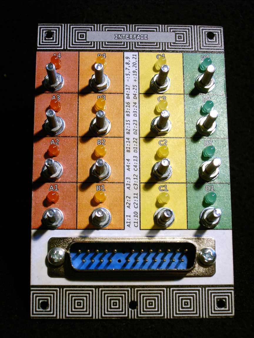 The interface connector is a 25p sub-D connector with 2 pins removed so I can also plug in a 9p connector (8 in/out & -). The 25p connector has 3 pins