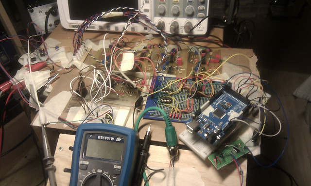 I haven't recorded any sounds yet, but I have done a couple of "integration" tests, the first in the picture was just 4 oscillators (at the top) and 4 VCAs, I use an Arduino for midi input (lower right), DAC control (the breadboard under the arduino) and multiplexing (the blue board, I use a CD4051 for 8 outputs).