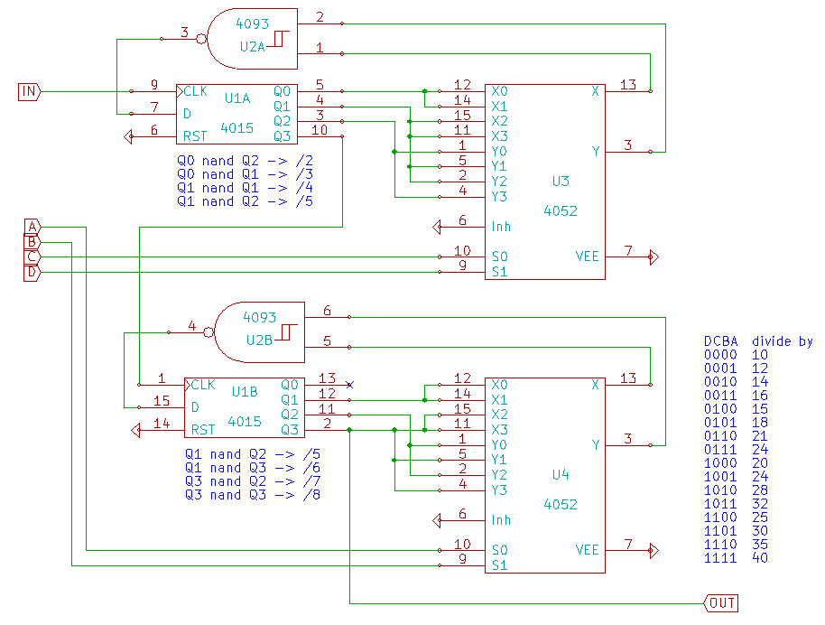 I also thought about using the 4040, but it has that inverted CLK input so I used the CD4029 instead.