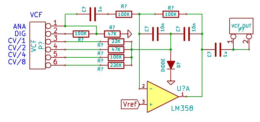 The VCF is a very simple but effective low pass filter design with a bit of resonance, but no self-resonance. The diode current from a control voltage through a resistor network determines the filter response.