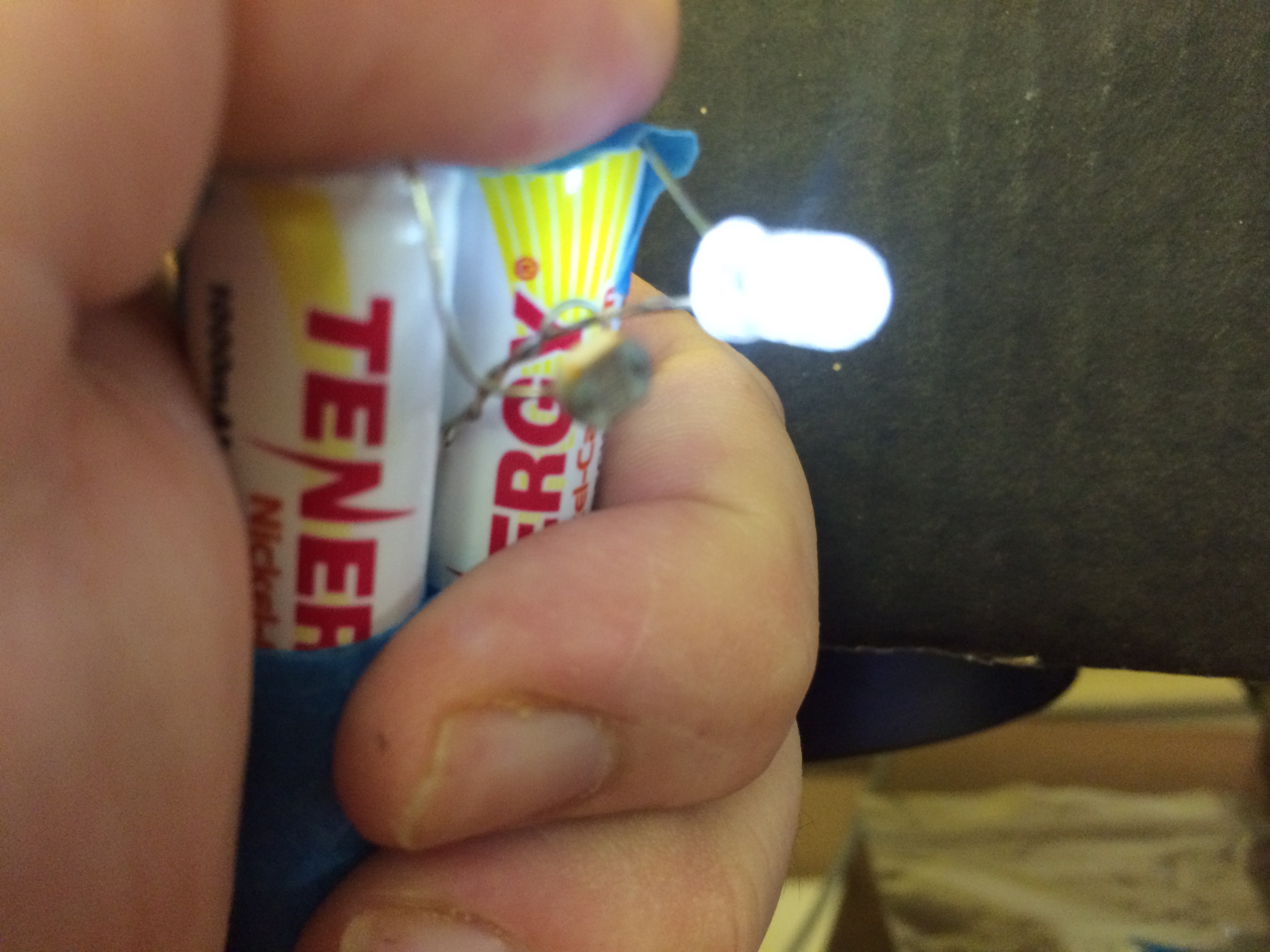 So I taped them up with blue painter's tape that I have from 3D printing and took one CdS cell and one LED, connected them in series at the positive terminal of the LED (CdS cells are non-polarized), and taped them to the battery ends.