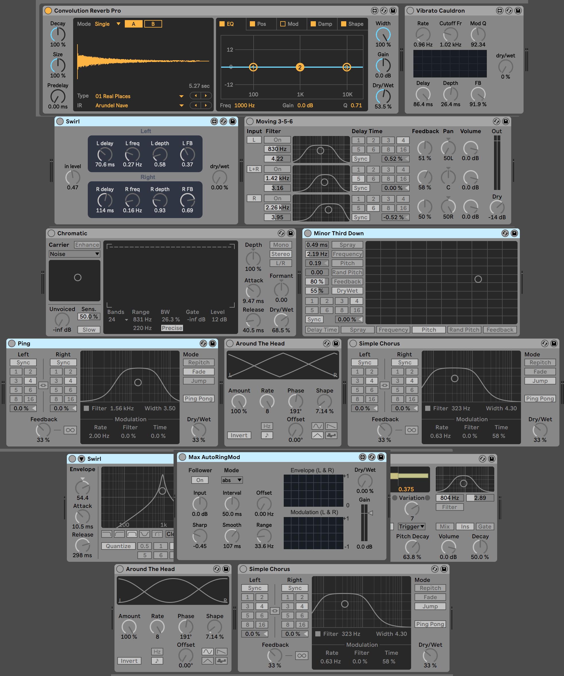 I have been experimenting with various kind of post-processing FX in Live, downstream from my 3 mixers. All feedback-driven signal generation is in the mixers, with Live FX post-processing downstream from the mixers. The idea is to be able to tickle characteristics of a Live FX without taking hands off the mixer.