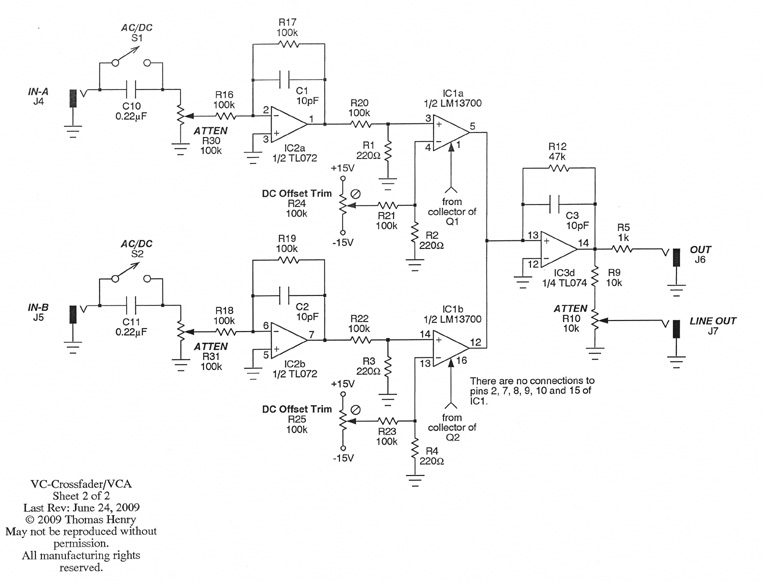 I would like to use this great circuit as a voltage controlled mixer (crossfader option on sheet 1 above). Because the master level would always be set to maximum level, and envelope control would not be needed, the whole branch to the left of R11 (between Q1 and Q2) seems unnecessary for a crossfader-only use. Am I right?