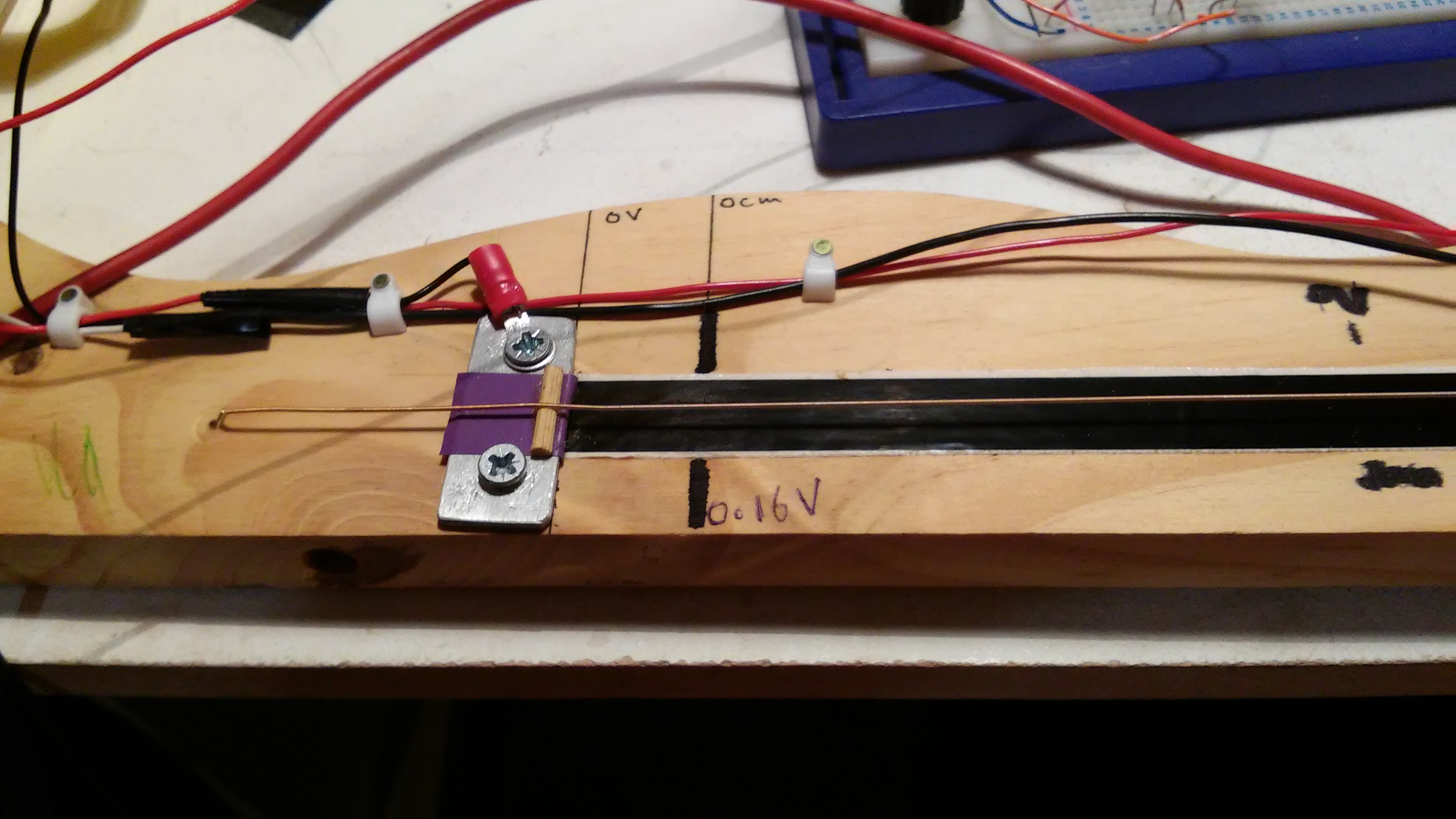 Blue Hell - not sure what you mean by 10% off? The bottom/left hand end of the ribbon is at ground but because of the mechanical construction of the ribbon it will never read 0V so I chose a low voltage of 0.16V - which is the closest I can get to 0V with my fat fingers and the tension on the string - and then looked at where the 1V increases where on the length of the ribbon. Look at the drawing and the photos to see this. As for the noise, yeah it's there. I actually do own a toy oscilloscope (DSO 138 - kit £13 off ebay) and the trace is not smooth. I hope some sort of insulator over the entire string/tape ensemble will help that.