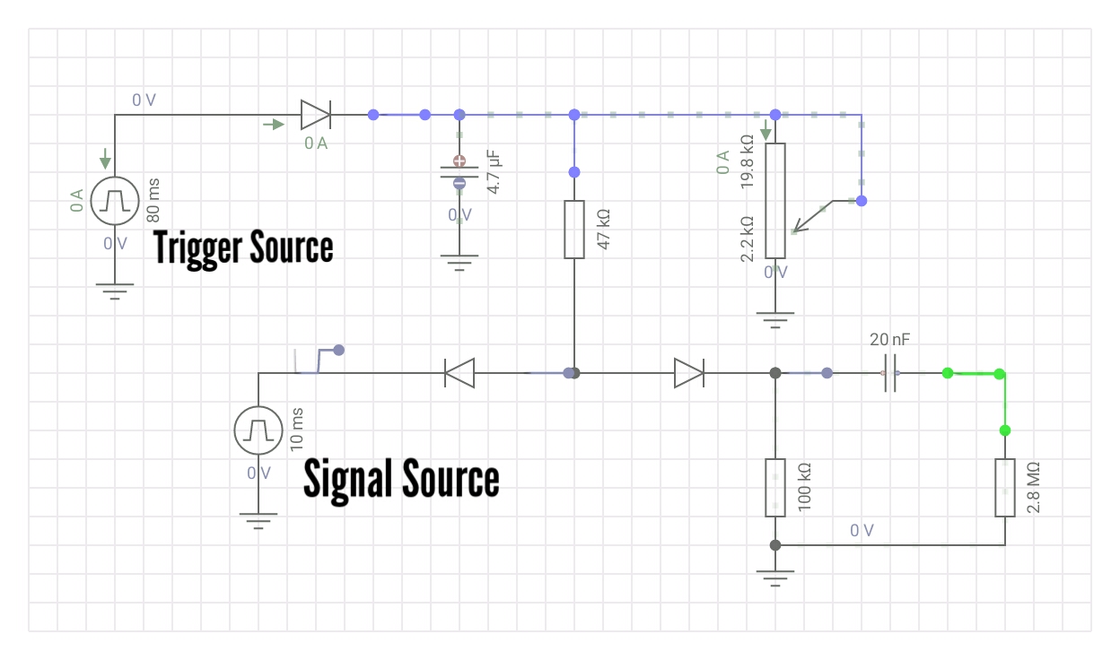 Basically, as CV rises, the rectangular wave from the digital output to be heard "stands up" at the junction of the two diodes and passes through the 100K resistor and the coupling capacitor. This method was used in paia's Stringz-n-Thingz and a similiar technique was used in their Cosmic EGG.