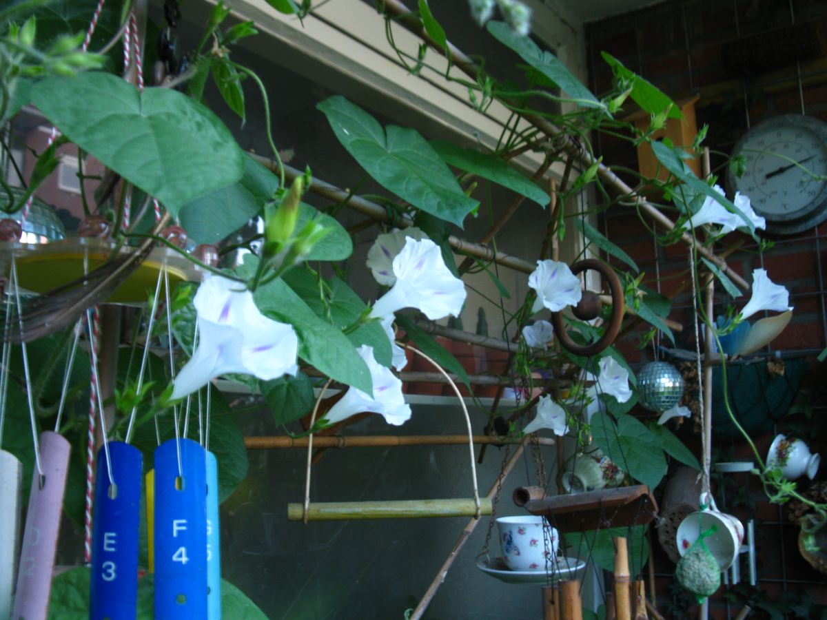 On this side things are dying off but I got some peppers and the Ipomoea lobata (Spanish flag morning glory) is flowering.