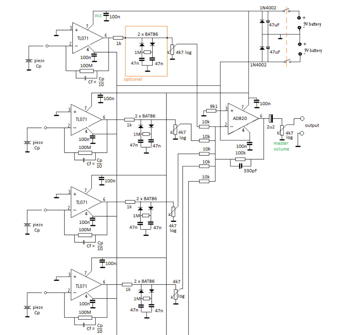 1. a piezo mixer / preamp requiring a bipolar +9 / -9V supply (schematic attached - note the original schematic had 5 channels, but I only need 4)