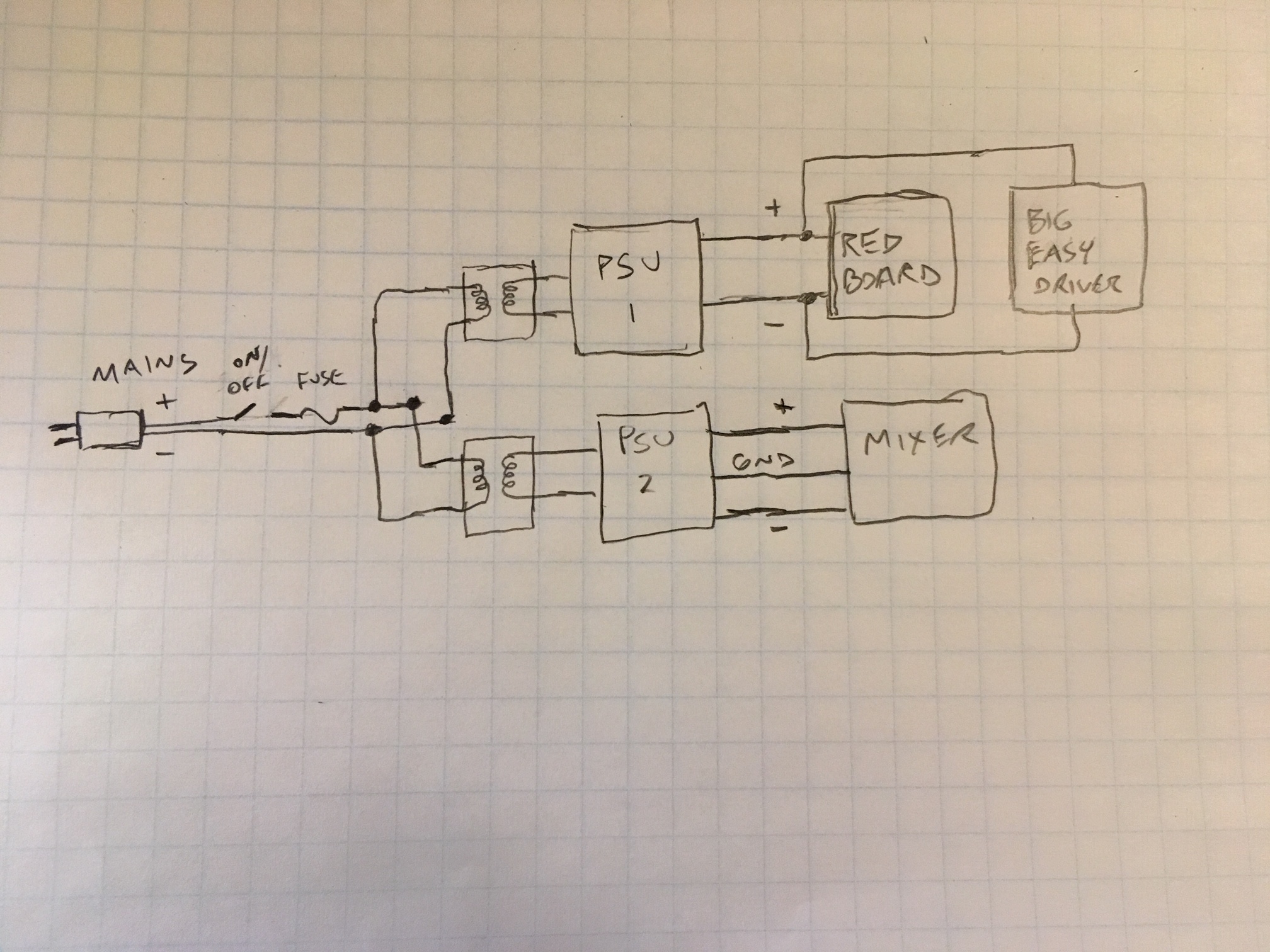 I have everything built and working; I am currently powering the Big Easy Driver with this supply https://www.amazon.com/gp/product/B073QTNF9F/ref=ppx_yo_dt_b_search_asin_title?ie=UTF8&psc=1 the RedBoard is powered via the USB of my laptop, and the mixer is powered by my bench power supply. I now want to mount everything permanently in my project box so that I have a single cord and on/off switch.