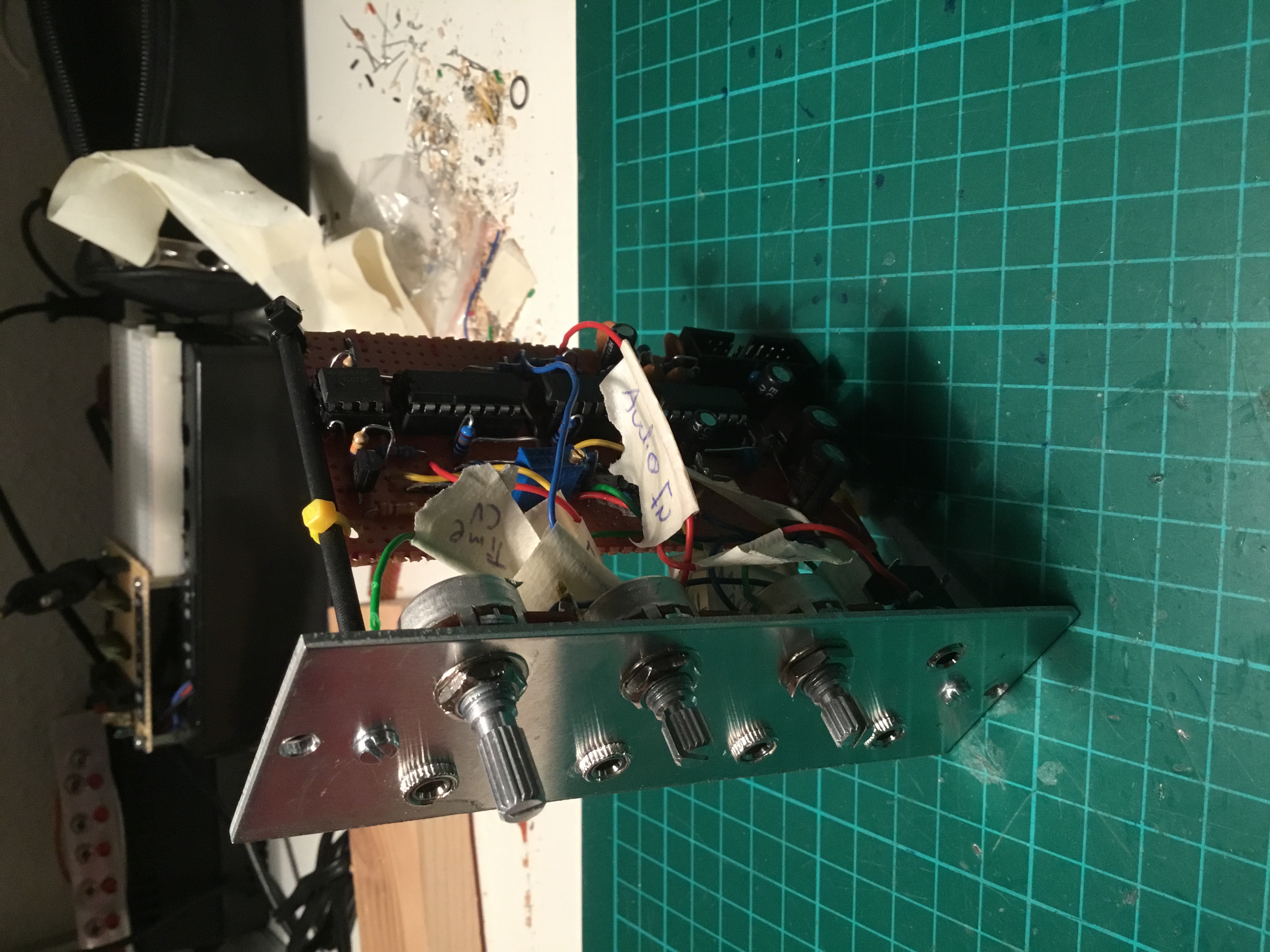 MEANWHILE: another Schmitzbit is bothering me - a dual „Fastest Envelope In The West“. Once again I designed and carefully counter checked the stripboard layout with the schematic, then soldered everyhting together (the first EG so far, not the second, almost identical board), made a crappy panel, attached all the parts plus additional LEDs and got it running sort of...