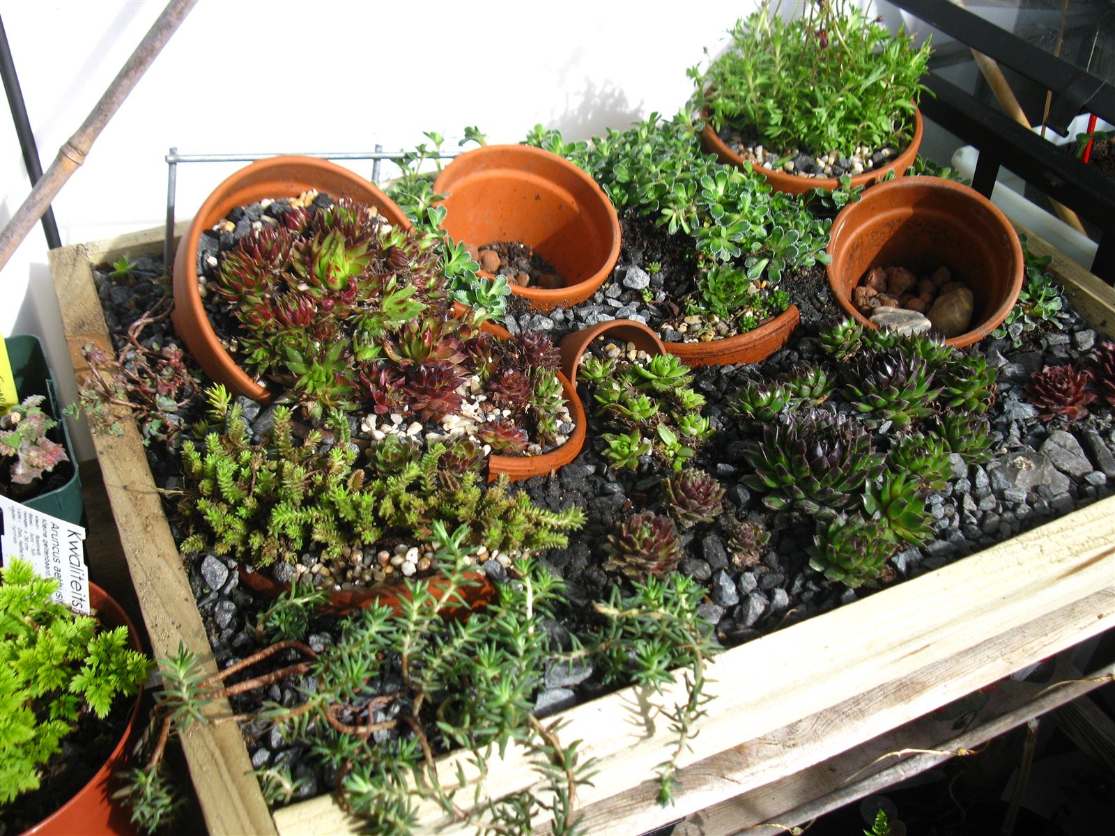 Sedum pachyclados and Lewisia cotyledon 'sunset' have been transplanted to the 2 unused pots in the alpine planter.