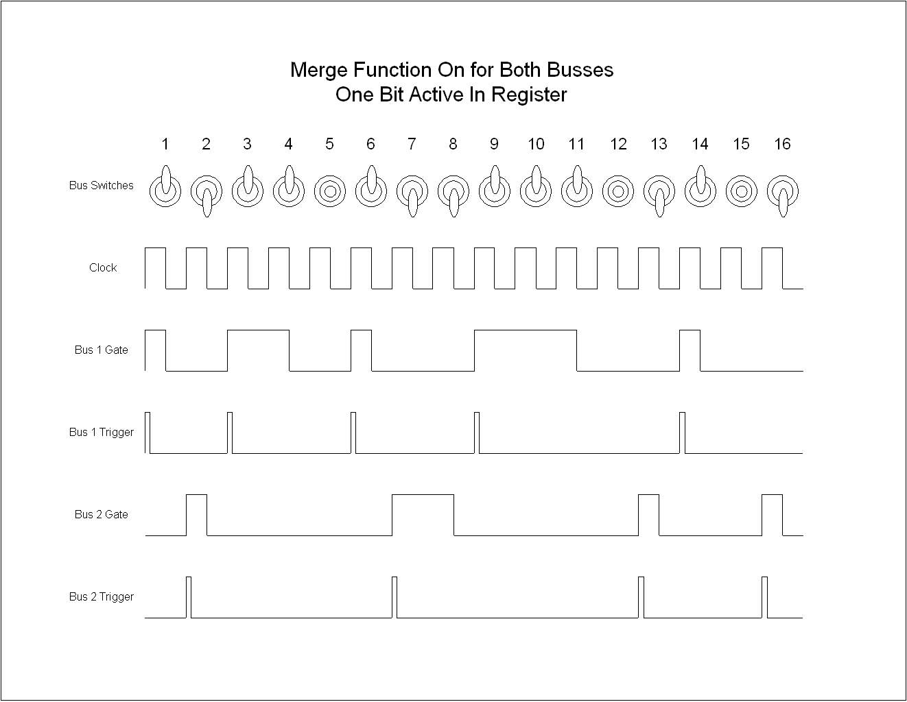 I've attached a couple of illustrations of the merge function. They illustrate the row of bus switches in varying up (bus 1 selected), down (bus 2 selected) and middle (no bus selected) positions. Below that is the clock signal, and below that are the gate and trigger outputs of each bus.