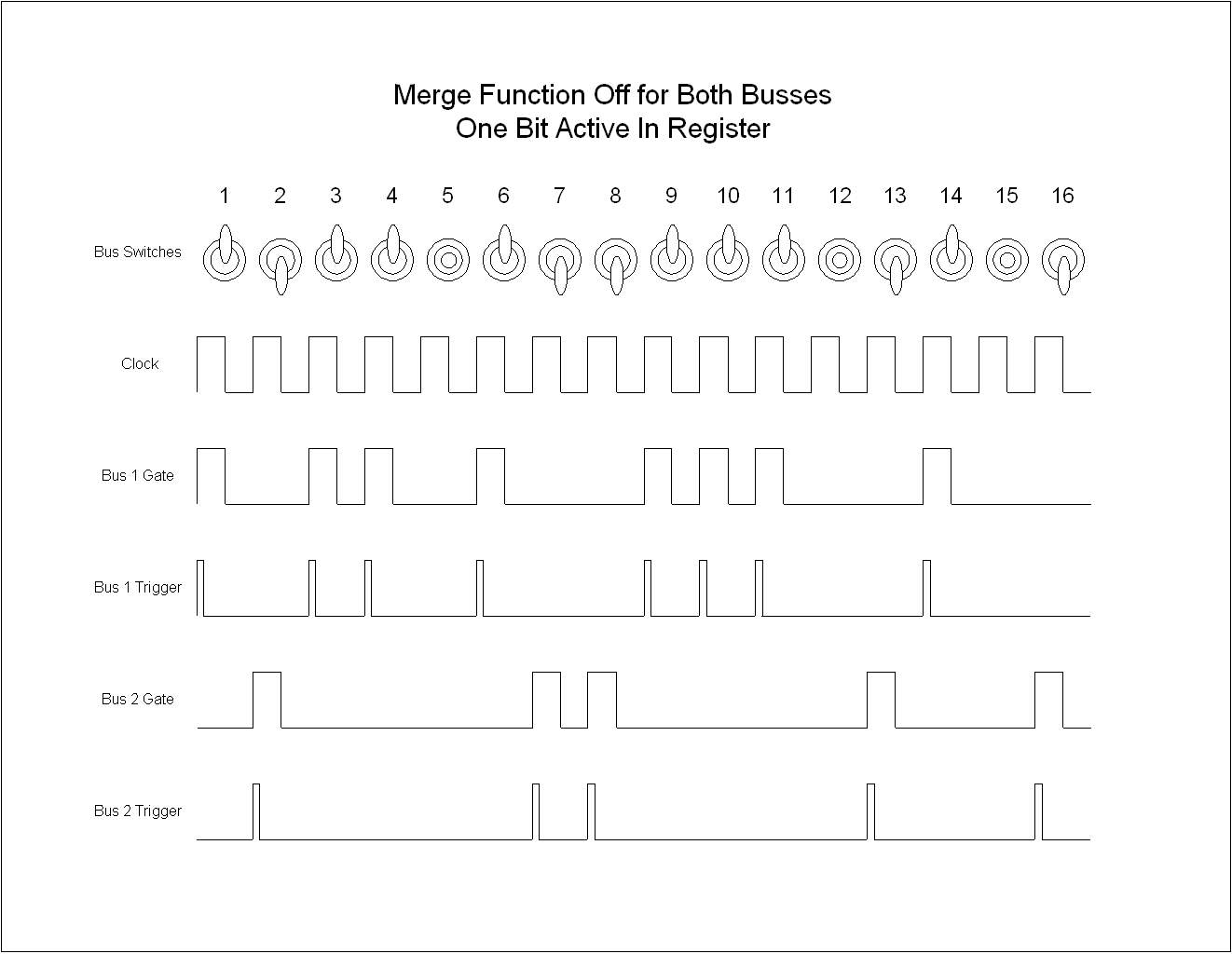 I've attached a couple of illustrations of the merge function. They illustrate the row of bus switches in varying up (bus 1 selected), down (bus 2 selected) and middle (no bus selected) positions. Below that is the clock signal, and below that are the gate and trigger outputs of each bus.