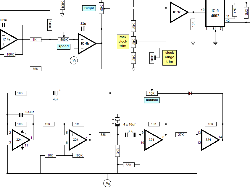 The summed control voltage (Manual, Pedal, LFO, Envelope follower) is fed into a sub audio BPF, then into a nonlinear amplifier with positive feedback (not a schmitt trigger, but similar), and then filtered by a second BPF. A variable portion of this is mixed to the straight CV to control the BBD's clock frequency. The effect is most prominent on single-shot, non-periodic CV changes, such as a fast single Manual of Pedal sweep. The single sweep is followed by smooth "echoes" that go in either direction (faster clock and slower clock). This is to emulate the "bouncing" tape speed of reel-to-reel tape machines when the friction from a thump against the reel is suddenly released.