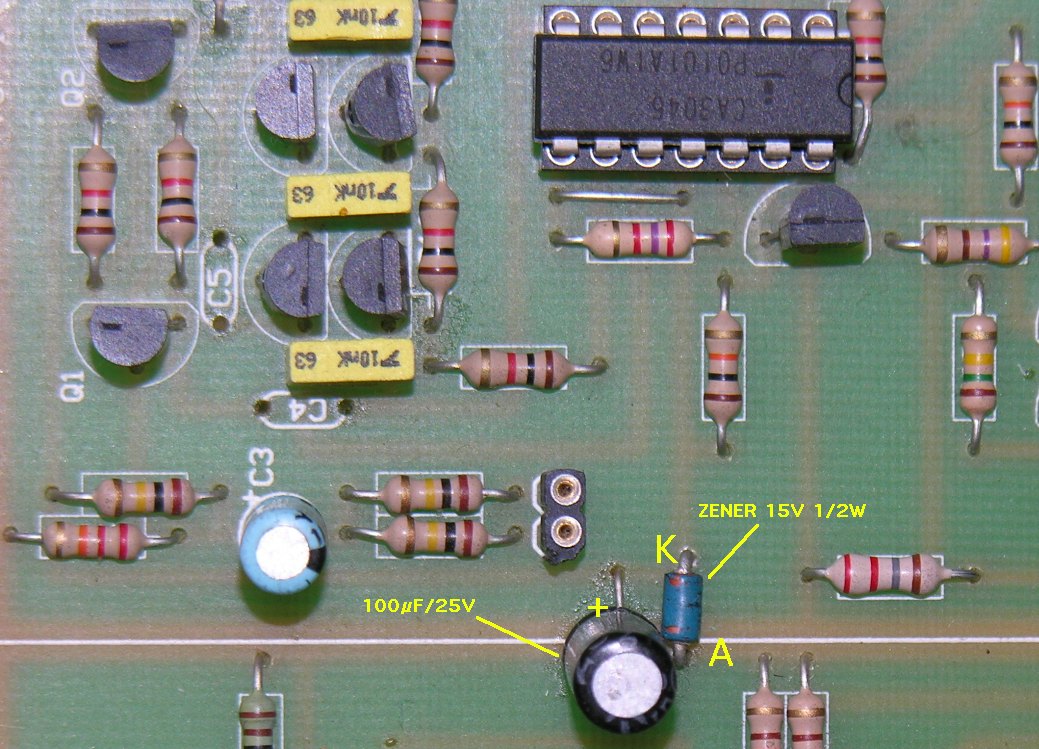 | Modification of the HP section of the Moog VCF of the wildcat to cure the humming issue. Added are a 15V 1/2W zener diode and a polarized 100µF capacitor. Note that on this photo C3 and C4 are missing because I simply deactivated the HP section that is t |