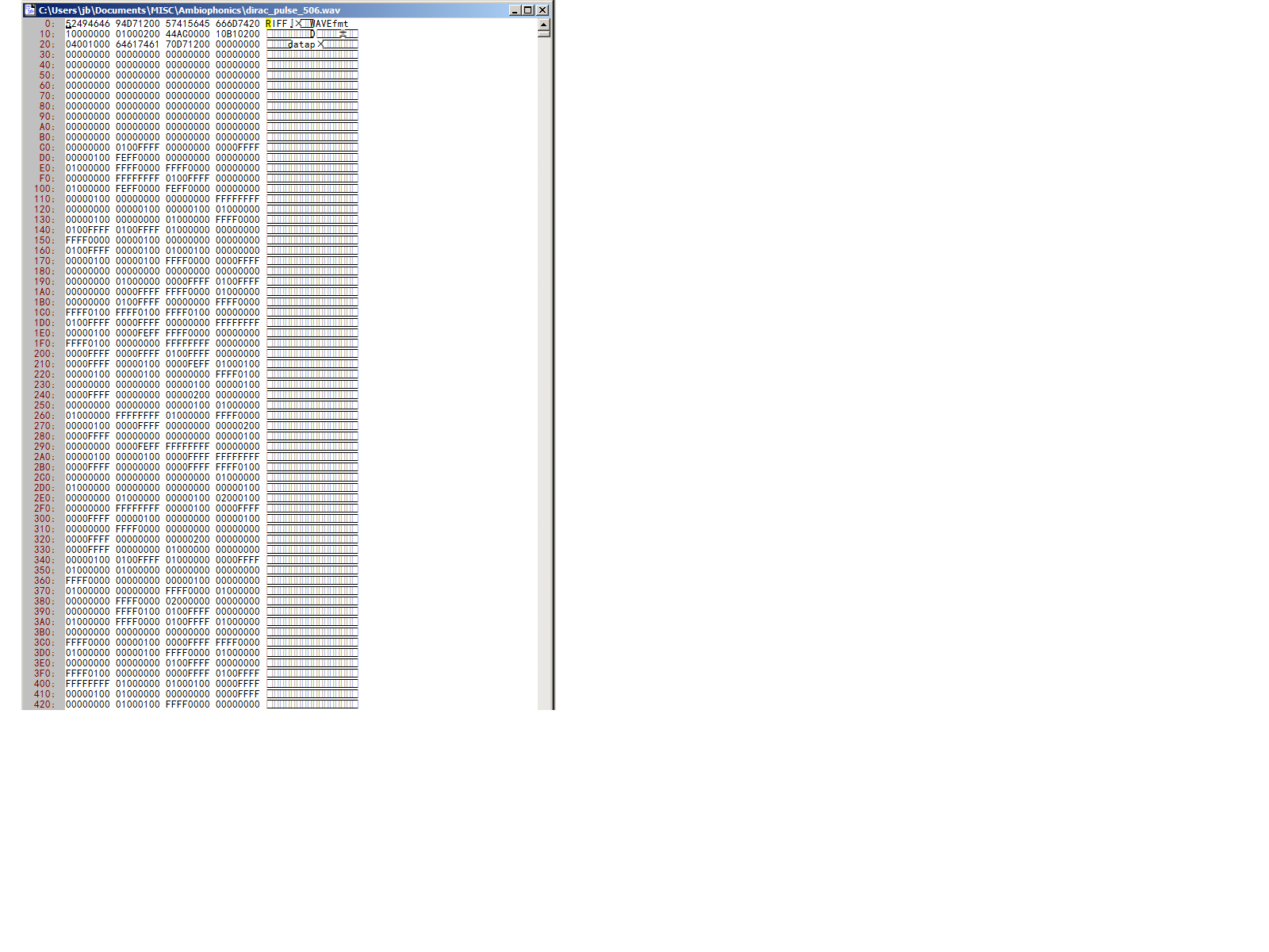 | Quote: | | The amplitude of the pulse is less than maximum suggesting the file was normalized. The pre- and post-ringing is indicative of a filter. The low level noise seen in the hex dump is indicative of dither and persists throughout the file. |