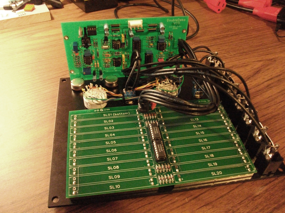 Ack! A major problem has occurred. Why, I don't know. I hadn't used my doubledekka for a while, in fact had removed the power cable, as I'm short of power cables and needed it elsewhere. Plugged it back up, and I'm only getting one pitch out of it - the knobs and pitch cv ins aren't doing anything. The sync and ring in jacks do work, and the sliders are affecting the sound, so my guess is a chip has decided to die on me - but which one? Or something else? Any ideas are welcome.
