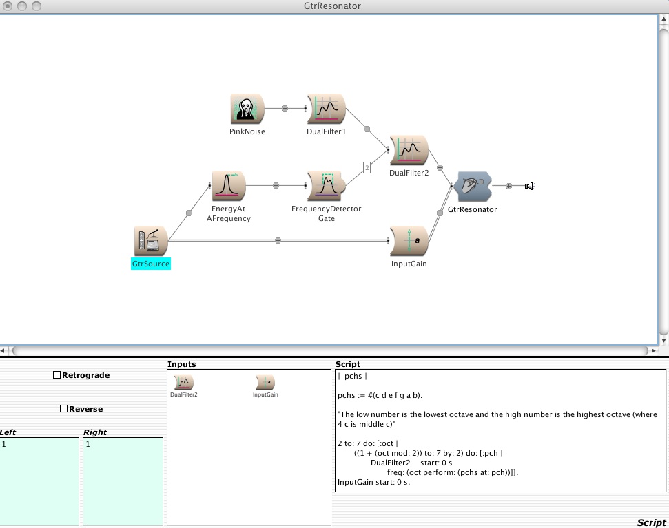 So now we get back to the script in GtrResonator. This is a smalltalk script which is used to create the "Sound" based on the modules to its left in the signal chain.