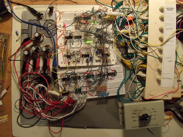 2. an arpeggiator thing, from the "fun with sea moss" site. 4 oscillators on a 40106 into a 4051 and a resistor ladder.