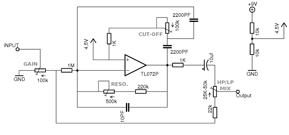 Dirt VCLPF is a very simple inverting twin t filter with a drive/gain stage. You can Ignore the lower part, it is just my power supply. Just connect VCC with 9V or 12V and it will run fine. Maybe put some filter caps between VCC and GND, because this filter is very sensitive to shitty wallwarts which will introduce some noise to the output signal.