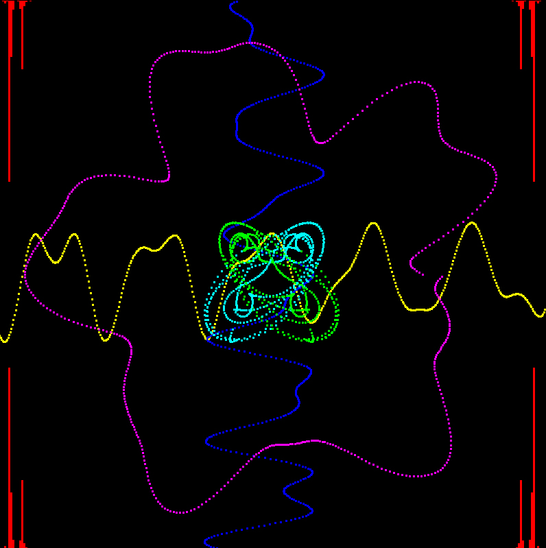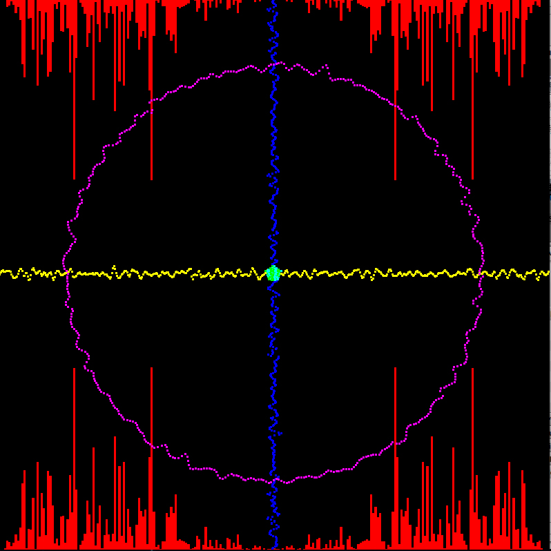 The magenta trace is just time domain plotted around a circle 3/4ths of the way out from the center. We are designing this for use in the planetarium. Finally, the red bars in the corners are mirror images of the frequency domain plot.