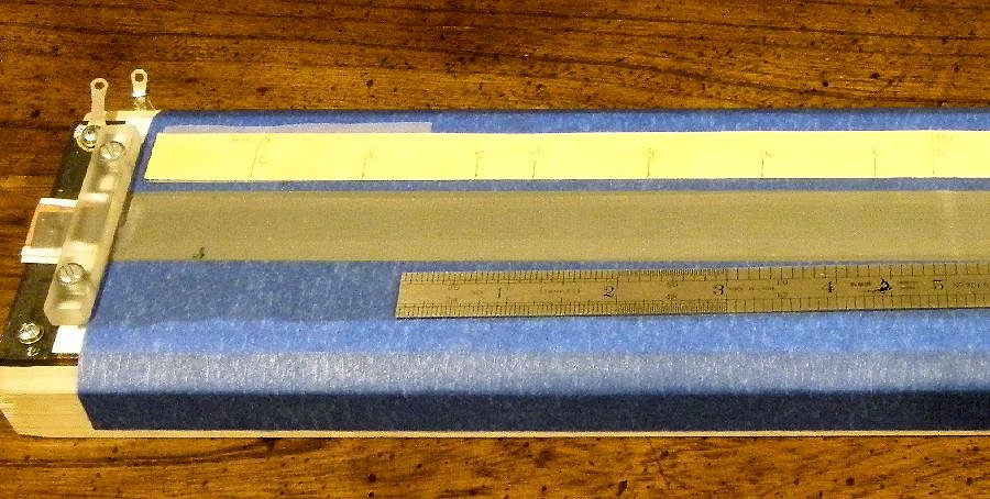 Here's another ribbon version. This one is built on a two foot long base, with an active length of ~530mm. In this version, the resistive strip is painted directly on a plexiglas substrate. It has been carefully adjusted to have better than 1% linearity. The conductive-tape ribbon is suspended over the strip by a piece of rubber cut from an exercise band. This forms a nice and wide and very comfortable, organic-feeling trough for the finger to ride in. The top layer is Nexcare "flexible clear" tape from the drug store. It has a nice tooth so you can feel your finger move without having a lot of friction or bending resistance. This device is an absolute joy to play. It kicks the crap out of the softpot with its narrow, unconfined, hard and sticky surface.