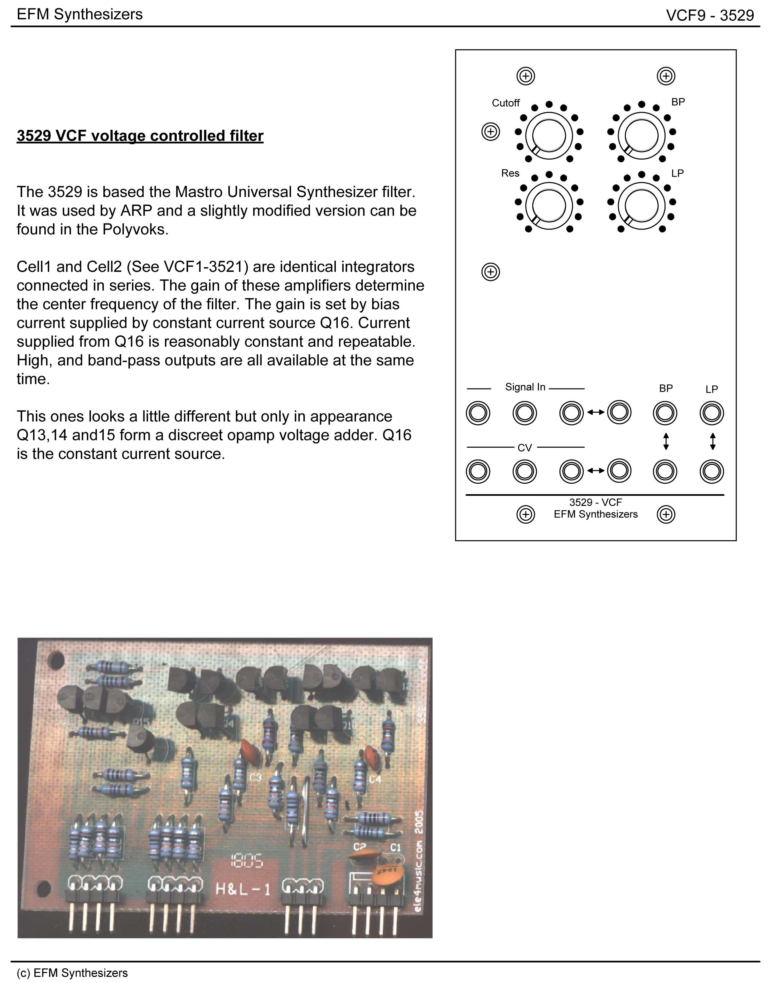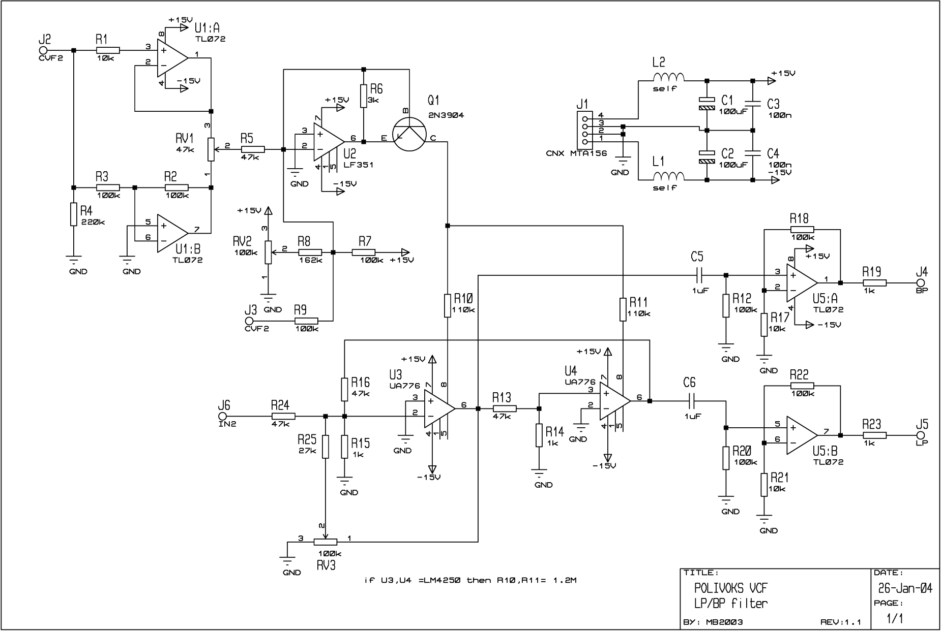 This filter is a clone of the famous vintage russian analog synthetiser named .Inside this synth there is an incredible and very original filter invented by Vladimir Kuzmin. Please visit his web site at http://www.muztech.com . It is a Lowpass ( LP) and Bandpass (BP) voltage controled filter with a special design and sound . A Vodka filter...The clone contains only cheap common parts, and it is very simple to build... No calibration trimmers or accurate tempco stages required, it is not the spirit of this beast from the far East ...
